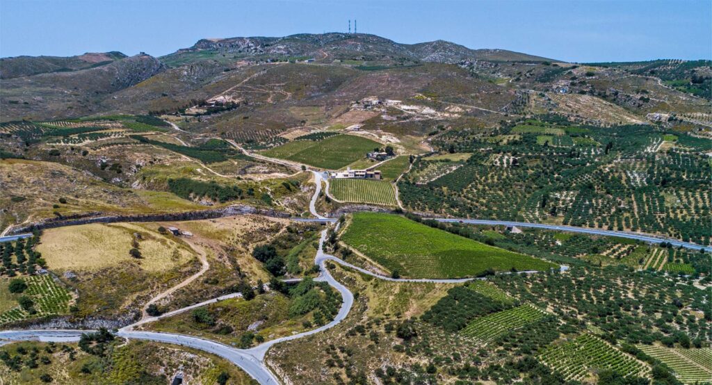 Located in central-northern Heraklion, the PDO Peza zone – recognised for reds in 1971 and whites in 1982 – covers villages such as Peza, Katalagari, and Myrtia. Vineyards lie between 300 and 800 meters on calcareous soils, sheltered from hot southern winds by mountains, and cooled by northern breezes for gradual maturation.